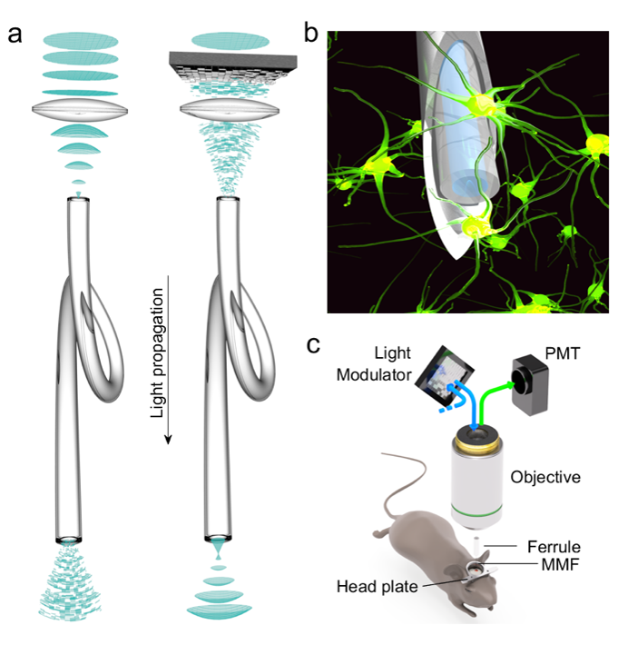 Fig. 1: Holographic endoscopy. (a) Coherent light propagated through a MMF forms a speckle pattern at the output (left). Manipulation of the wavefront entering the MMF yields a desired optical field, e.g. a focal spot (right). (b, c) Experimental configuration for in vivo imaging.