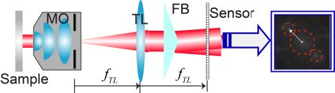 The optical configuration of the proposed common-path DHM system operates using a briprism illustrated in Figure 1. And the major component of the proposed system is inserting the FB between the tube lens (TL) and the sensor plane. Thus, at any observation plane behind the FB, there is a coherent superposition between the two split beams generated by the biprism. Sinusoidal fringes are generated in the region of superposition and its maximum lateral extension is given by L/2 where L is the biprim’s lateral extension. It is important to mention that, in this common-path DHM system, one only reconstructs the phase information that it is encoded within the fringes’ FOV (e.g. cone-shape region).