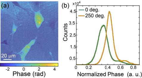 The benefits of assembling all five features of high speed, high resolution, high accuracy, high stability and polarization sensitivity in the proposed system are exhibited by imaging a monolayer of human U87 glioblastoma cells. Figure 2(a) shows the phase information from U87 glioblastoma cells. To provide polarization-sensitive (PS) measurements, the sample is illuminated with linear polarized light whose plane-of-vibration is varied by rotating a linear polarizer inserted before the sample holder in Fig. 1 (not shown). Figure 2(b) shows the phase histograms of the phase image from U87 glioblastoma cells illuminated with two different polarization angles. From the distinctive behavior of the cells at different polarization angles, we have demonstrated their anisotropic properties.