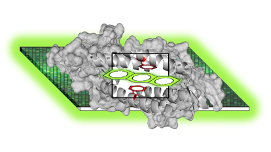 Figure 1. Spaced filled representation of the LmrR protein (in grey). Amino acids in the central part of the protein are highlighted in red and the dye, in the LmrR pocket, is represented as planar conjugated system in green. Behind the protein, emissive film representation formed using LmrR-dye complex.